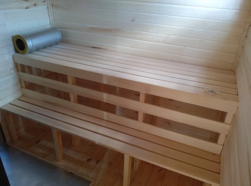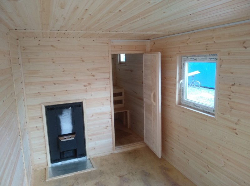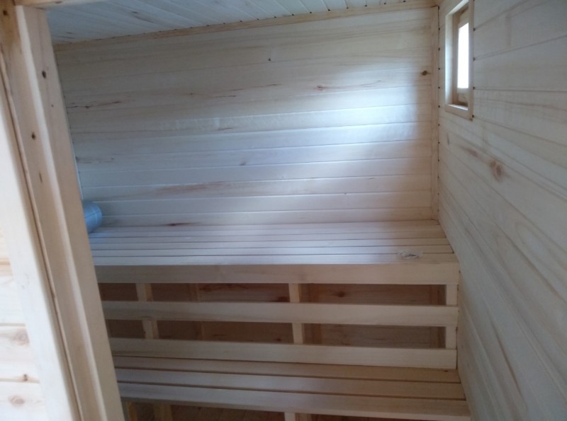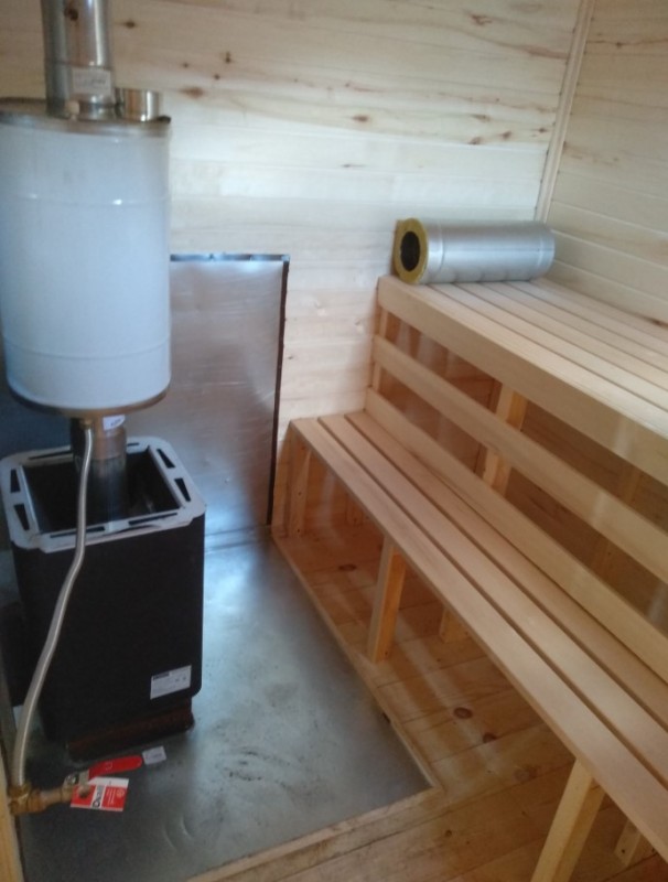 Дополнительно - печь дровяная, банная с баком на 50 л, теплоотражающий экран, вывод краника для горячей воды, 2-х ярусные липовые полки.